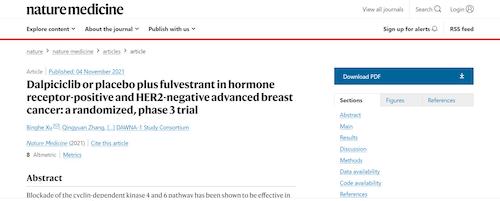 11月4日,国际四大医学期刊之一、英国《自然》旗下《自然医学》(Nature Medicine)在线发表CDK4/6抑制剂达尔西利(SHR6390)联合氟维司群治疗既往内分泌治疗后疾病进展的HR+/HER2-晚期乳腺癌的多中心、随机、双盲III期临床研究(DAWNA-1研究)中期分析结果报告,首次对氟维司群(雌激素受体降解剂)±达尔西利治疗激素受体阳性晚期乳腺癌的有效性和安全性进行了比较。研究结果显示,达尔西利+氟维司群组与安慰剂+氟维司群组相比,无进展生存期(PFS)显著延长。该项研究由中国医学科学院肿瘤医院徐兵河教授担任leading PI,全国39家医院参研,由必一·运动(B-Sports)医药临床研发团队支持完成。