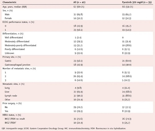 本研究是一项多中心、单臂、开放标签的剂量递增(1a)和剂量扩展(1b)的I期研究(ChiCTR2000029717),共招募了41例既往未接受过治疗的HER2阳性晚期不可切除或转移性胃和胃食管交界处腺癌患者,入组患者≥18周岁,根据RECIST v1.1标准有可测量病灶,ECOG评分为0-1。
