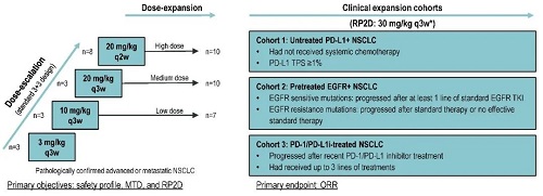 该I期研究(NCT03774979)分为剂量递增和剂量扩展2部分试验,随后在不同肿瘤类型、基因突变或既往经治的多个队列中进行临床扩展研究。本次ESMO ASIA大会中展示了3个NSCLC临床扩展队列的结果。队列1纳入未接受全身化疗,PD-L1 TPS≥1%的患者;队列2纳入既往接受至少一线EGFR TKI标准治疗失败的EGFR敏感突变患者,接受标准治疗耐药或没有有效标准治疗的方案的EGFR突变患者;队列3纳入既往接受抗PD-1/PD-L1单抗治疗后进展且最多接受3线治疗的患者。符合条件的患者给予SHR-1701 30 mg/kg,每3周1次。主要终点为客观缓解率ORR(RECIST v1.1)。次要终点为安全性、最大耐受剂量(MTD)及II期推荐剂量(RP2D)。