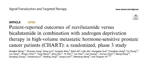 [3] Wang, H., Jiang, S., Luo, H. et al. Patient-reported outcomes of rezvilutamide versus bicalutamide in combination with androgen deprivation therapy in high-volume metastatic hormone-sensitive prostate cancer patients (CHART): a randomized, phase 3 study. Sig Transduct Target Ther 9, 351 (2024). http://doi.org/10.1038/s41392-024-02064-z
