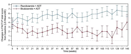 两组在所有时间点的FACT-P总分均较基线有所改善(最小二乘法[LS]均值为0.66-6.77;图7),瑞维鲁胺+ADT组的改善更为明显,组间LS均值差异为0.50-5.20。