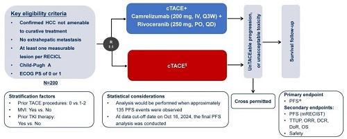 6. Qin S, Chan SL, Gu S, et al. Camrelizumab plus rivoceranib versus sorafenib as first-line therapy for unresectable hepatocellular carcinoma (CARES-310): a randomised, open-label, international phase 3 study. Lancet. 2023 Sep 30;402(10408):1133-1146.