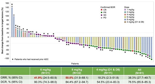共纳入81例尿路上皮癌患者(6和8mg/kg剂量组中位年龄:65岁);30%以上的患者接受过≥2线既往系统治疗,既往接受过Her2 ADC治疗比例超过35%。