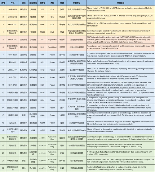 涉及的创新药包括6款已上市创新产品:注射用卡瑞利珠单抗(艾瑞卡®)、甲磺酸阿帕替尼片(艾坦®)、马来酸吡咯替尼片(艾瑞妮®)、羟乙磺酸达尔西利片(艾瑞康®)、阿得贝利单抗注射液(艾瑞利®)、氟唑帕利胶囊(艾瑞颐®),以及9款未上市创新产品:抗PD-L1/TGF-βRII双抗瑞拉芙普-α(SHR-1701)、多靶点受体酪氨酸激酶抑制剂法米替尼、IL-15融合蛋白SHR-1501、双特异性抗体SHR-2017、全人源抗CTLA-4单克隆抗体SHR-8068、抗体偶联药物(ADC)瑞康曲妥珠单抗(SHR-A1811)、SHR-1826、SHR-A1912、SHR-A2102。2类新药盐酸伊立替康脂质体注射液(II)(越优力®)及国内首仿药昂丹司琼口溶膜(艾其速®)各有1项研究入选。